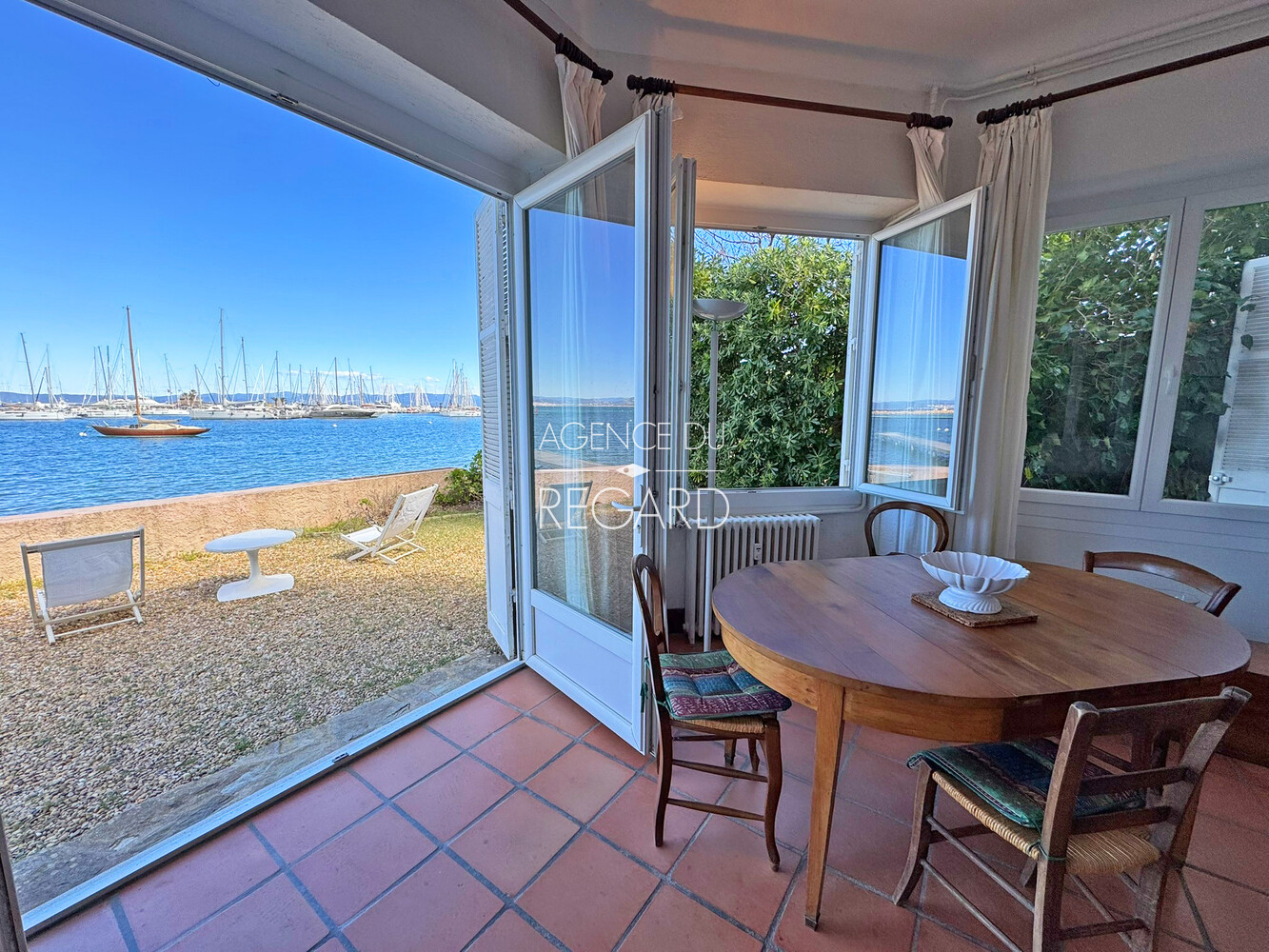 Exceptional! In Porquerolles, right on the water with its pontoon, this 87sqm apartment offers a magnificent view of the sea and the port. It is extended by a private garden of 96sqm, not overlooked, with 12 meters of sea frontage which gives direct access to the pontoon. Calm is required since it is away from the noise and tourist movements. Its access is on one level, via a beautifully flowered courtyard where bicycles can be parked and via a loggia converted into a common entrance hall. It has 3 bedrooms, 2 bathrooms with toilets, a kitchen and a living room which will require renovation work. DPE: E – GES: E