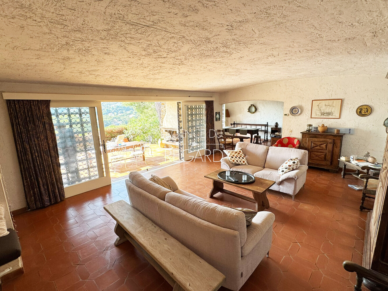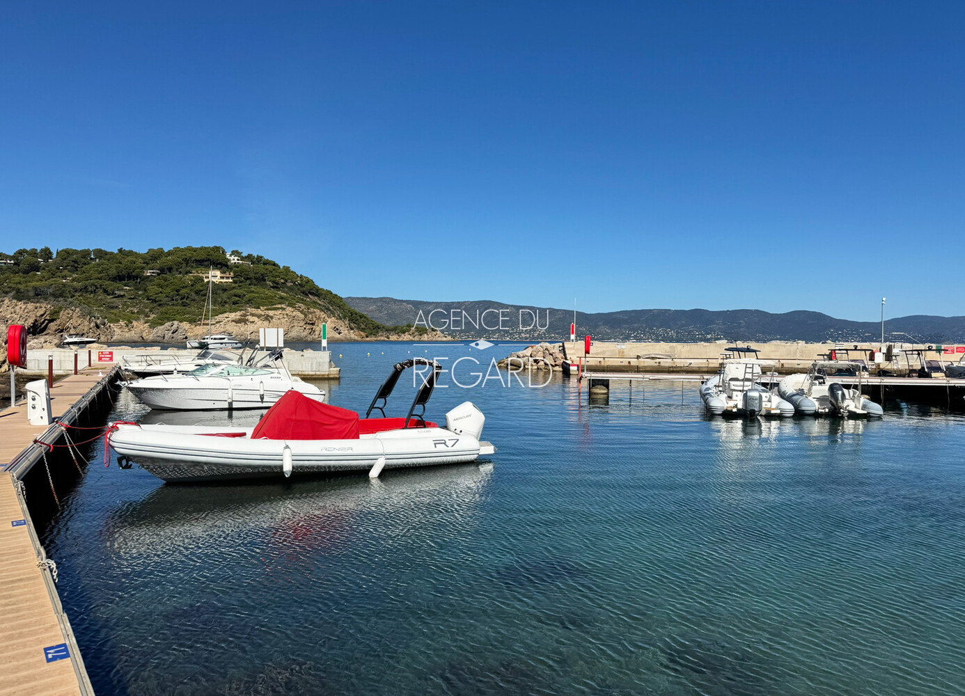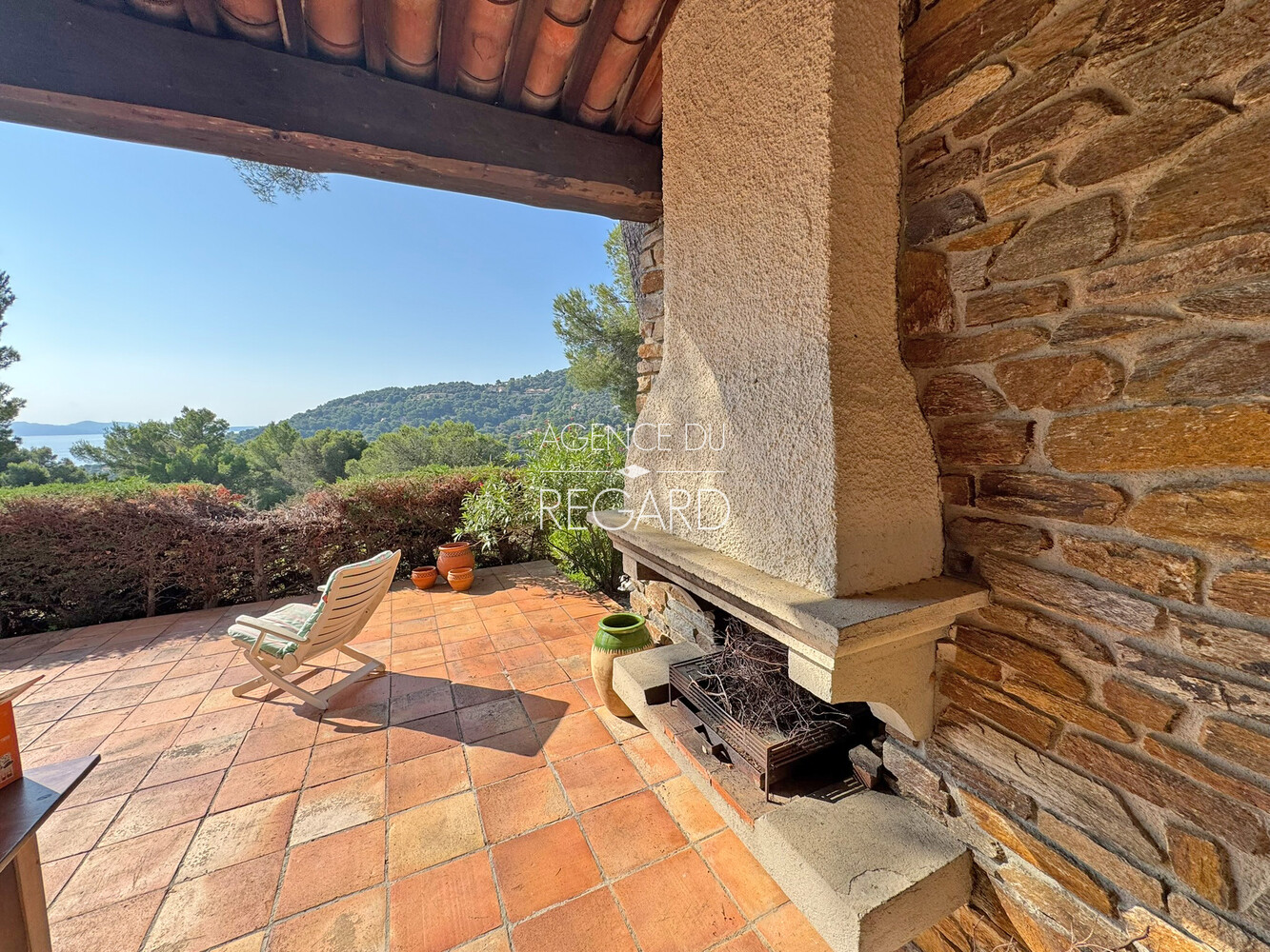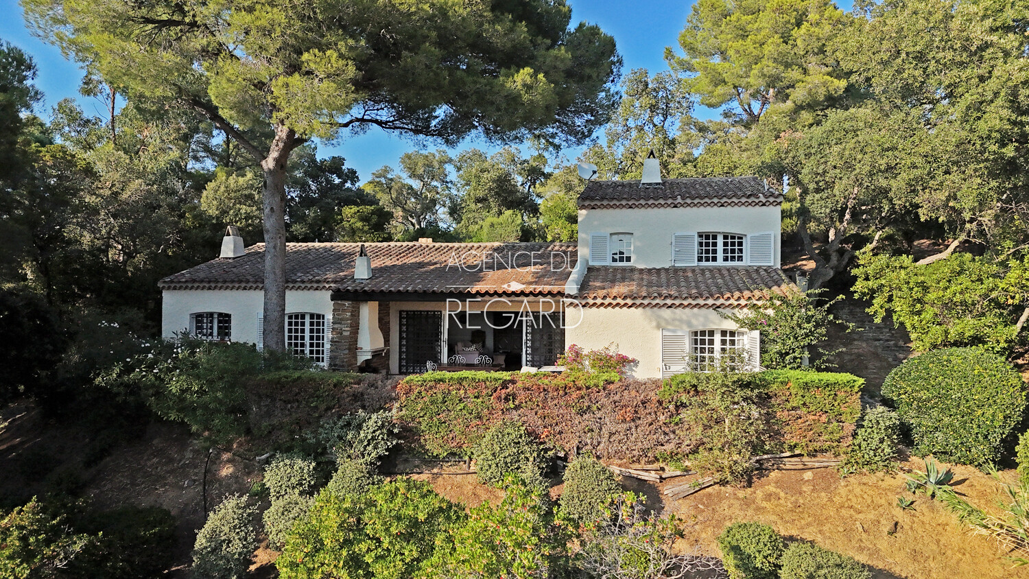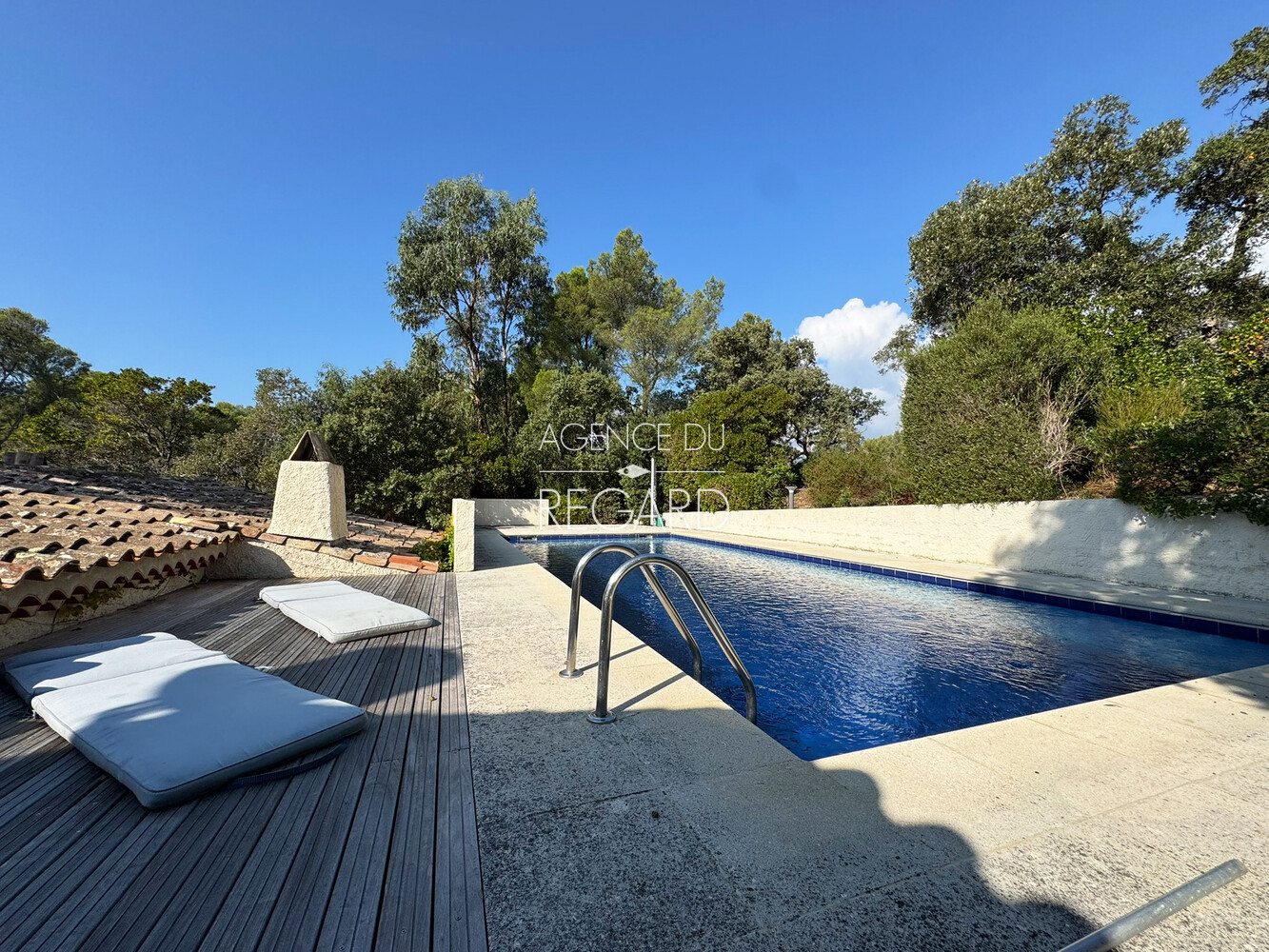 In Bormes-les-Mimosas, in the private and guard-gated Cap Bénat estate, this 1,600sqm property is just a 5 minutes walk from the beach. A pool area has been added to the rear of the house, surrounded by beautiful, colorful, and flowering vegetation. This traditional villa of 150sqm, built in 1970, has been well-maintained to this day. It extends onto a 42sqm south-facing terrace with a little sea view and Port Cros island. Swimming pool 10x4.5m .