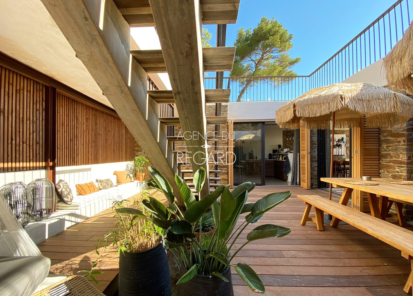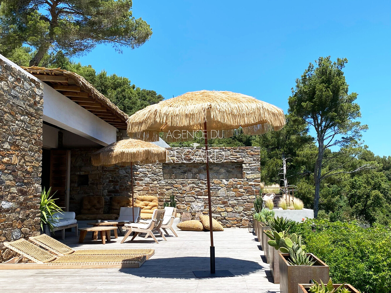 In Bormes-les-Mimosas, in the private and gated Gaou Bénat estate, this 755sqm property enjoys a peaceful, secluded setting and stunning sea views. The 104sqm villa has been tastefully renovated using high-quality materials, combining charm and contemporary comfort. A 29 sqm patio, sheltered from the prevailing winds, offers a transparent sea view. The house extends onto a wooden terrace and then a pool area, revealing a magnificent sea panorama. 3 bedrooms (possibility of 4). Beach 20 minutes walk away. 10x3.5m swimming pool. Pantry. Energy Performance Certificate (EPC) in progress.