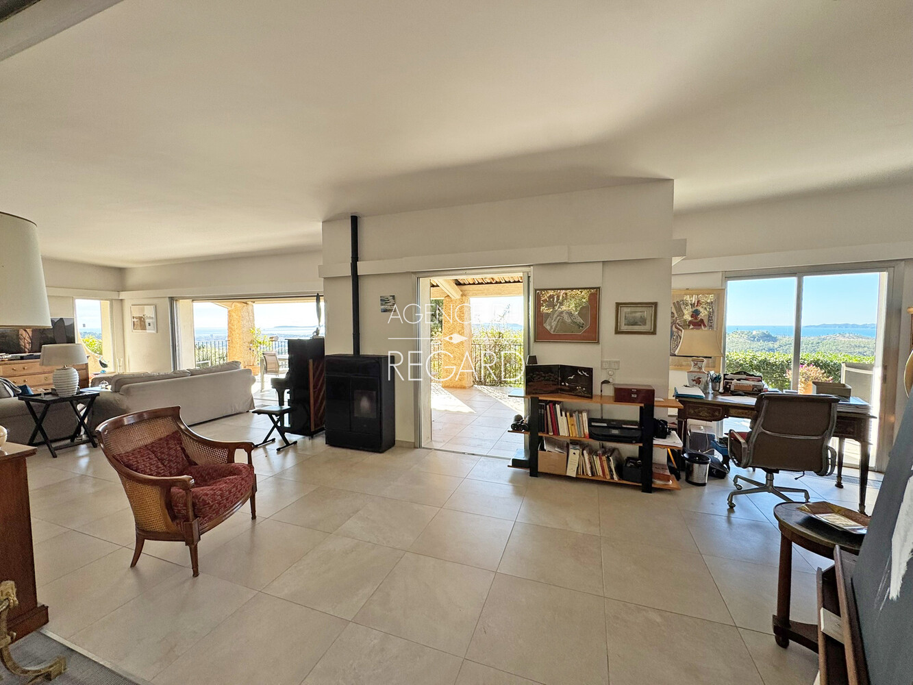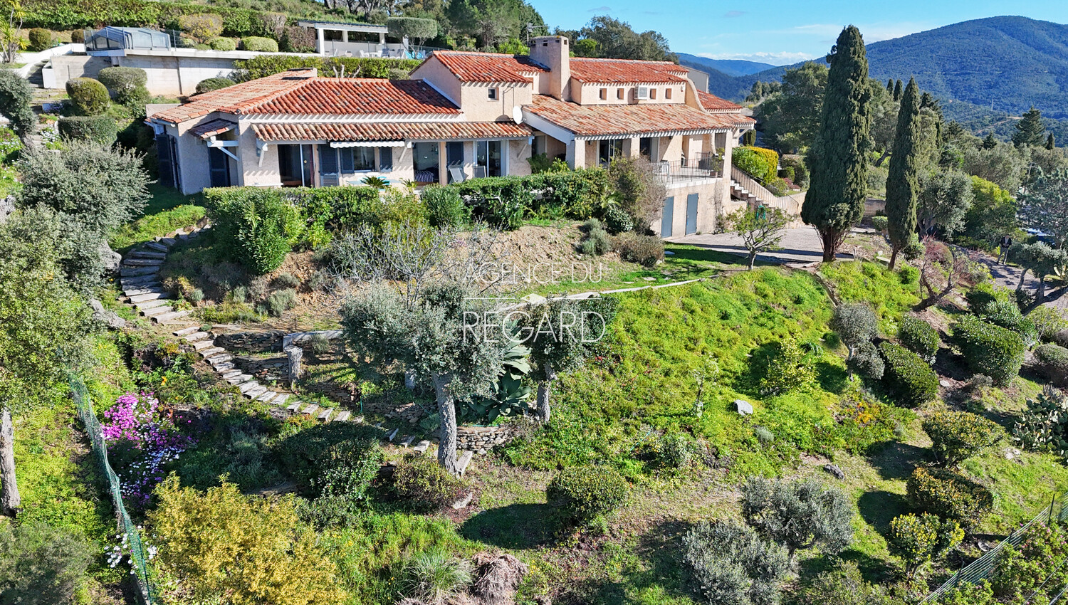This 2,24sqm property is located between La Londe-les-Maures and Bormes-les-Mimosas, 15 minutes drive from their beaches and harbors. Situated atop a hill, the land is fully fenced and landscaped with wide terraces. It offers exceptional panoramic views of the sea, Golden islands, as well as Mount Coudon and Mount Faron. The traditional villa, of 260sqm, features a spacious 70sqm reception room extending onto a covered terrace with magnificent sea views. There is also a separate apartment, a pool house, an 11x6m swimming pool, a hammam, a pétanque court, two cellars, and a carport.