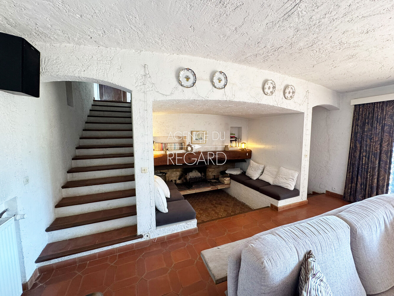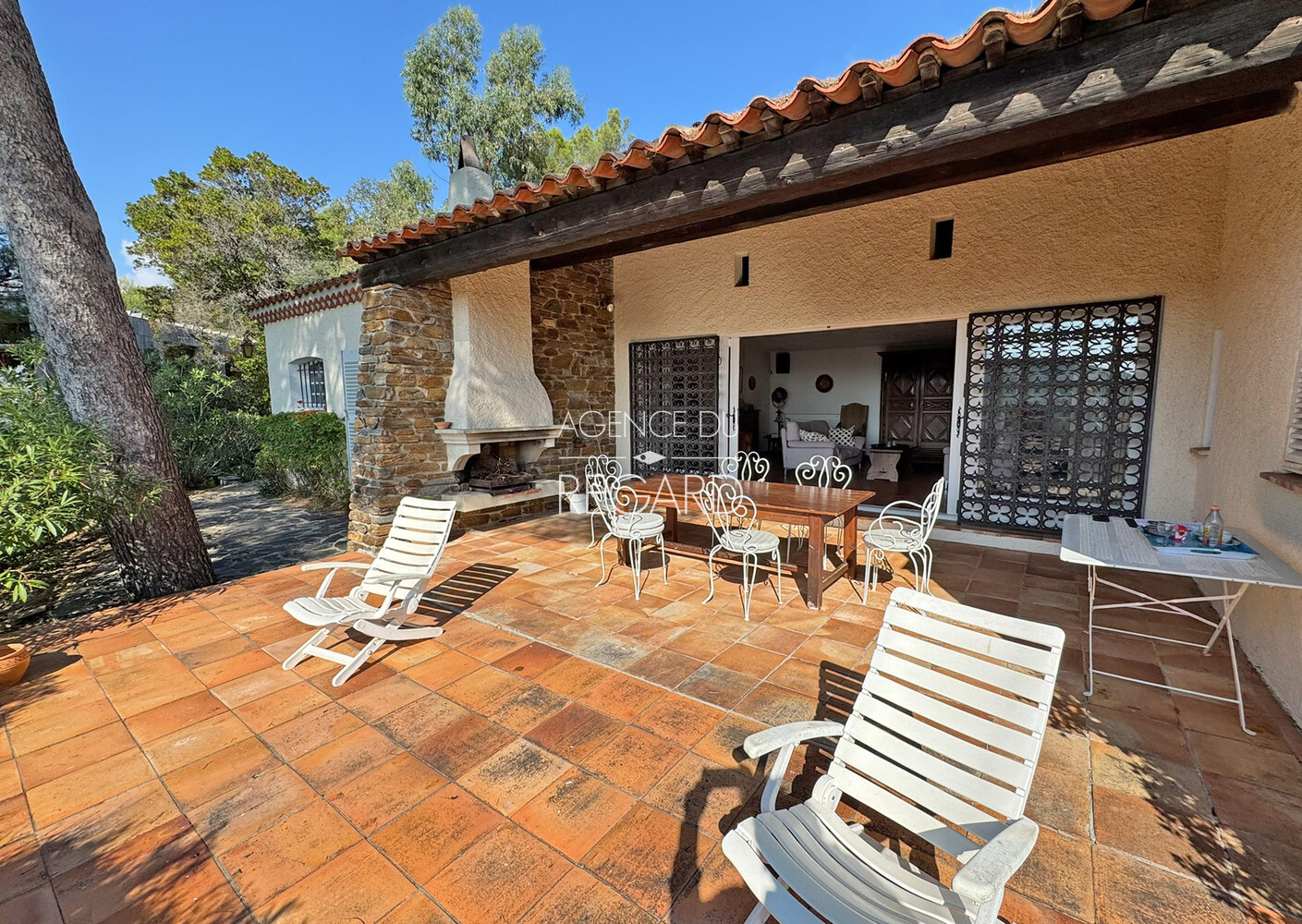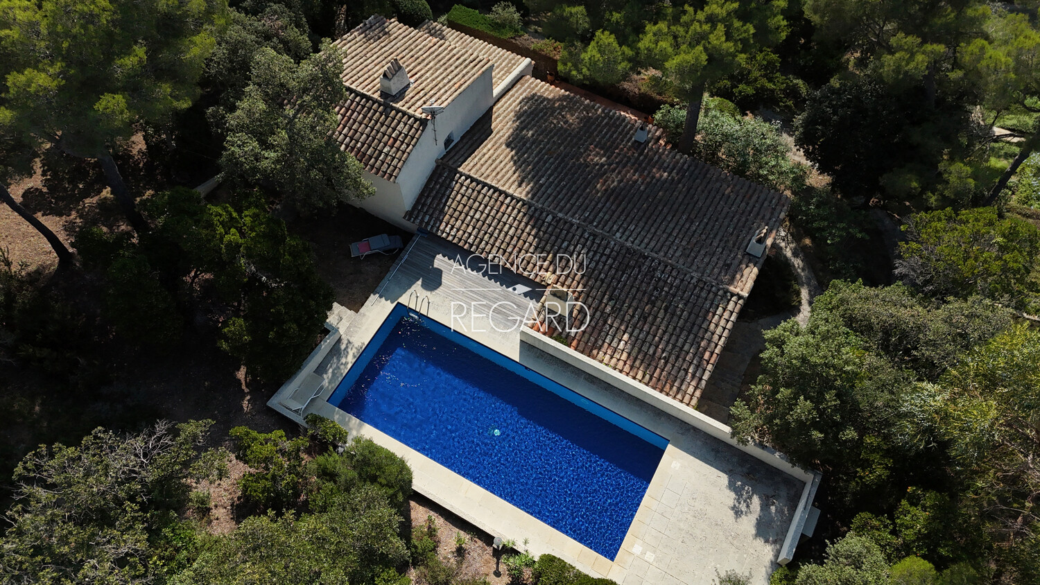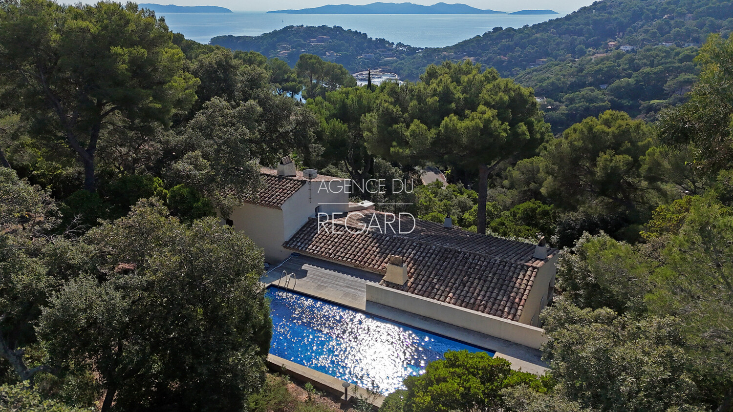 In Bormes-les-Mimosas, in the private and guard-gated Cap Bénat estate, this 1,600sqm property is just a 5 minutes walk from the beach. A pool area has been added to the rear of the house, surrounded by beautiful, colorful, and flowering vegetation. This traditional villa of 150sqm, built in 1970, has been well-maintained to this day. It extends onto a 42sqm south-facing terrace with a little sea view and Port Cros island. Swimming pool 10x4.5m .