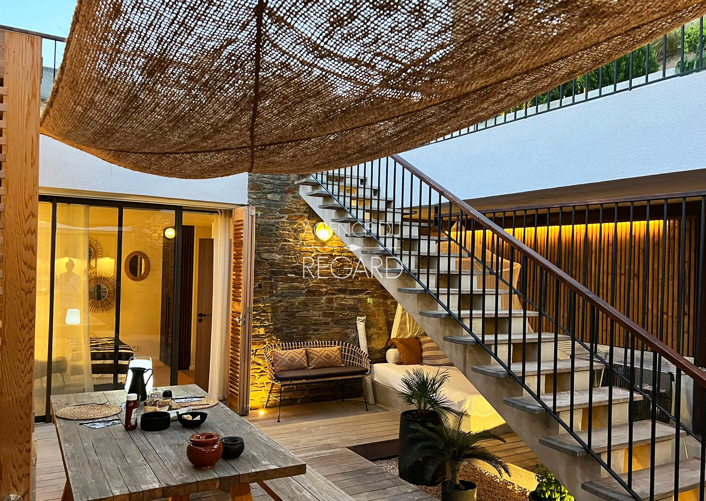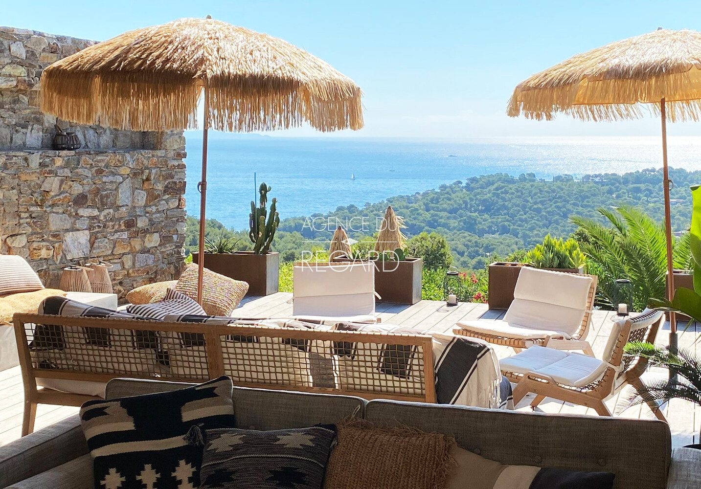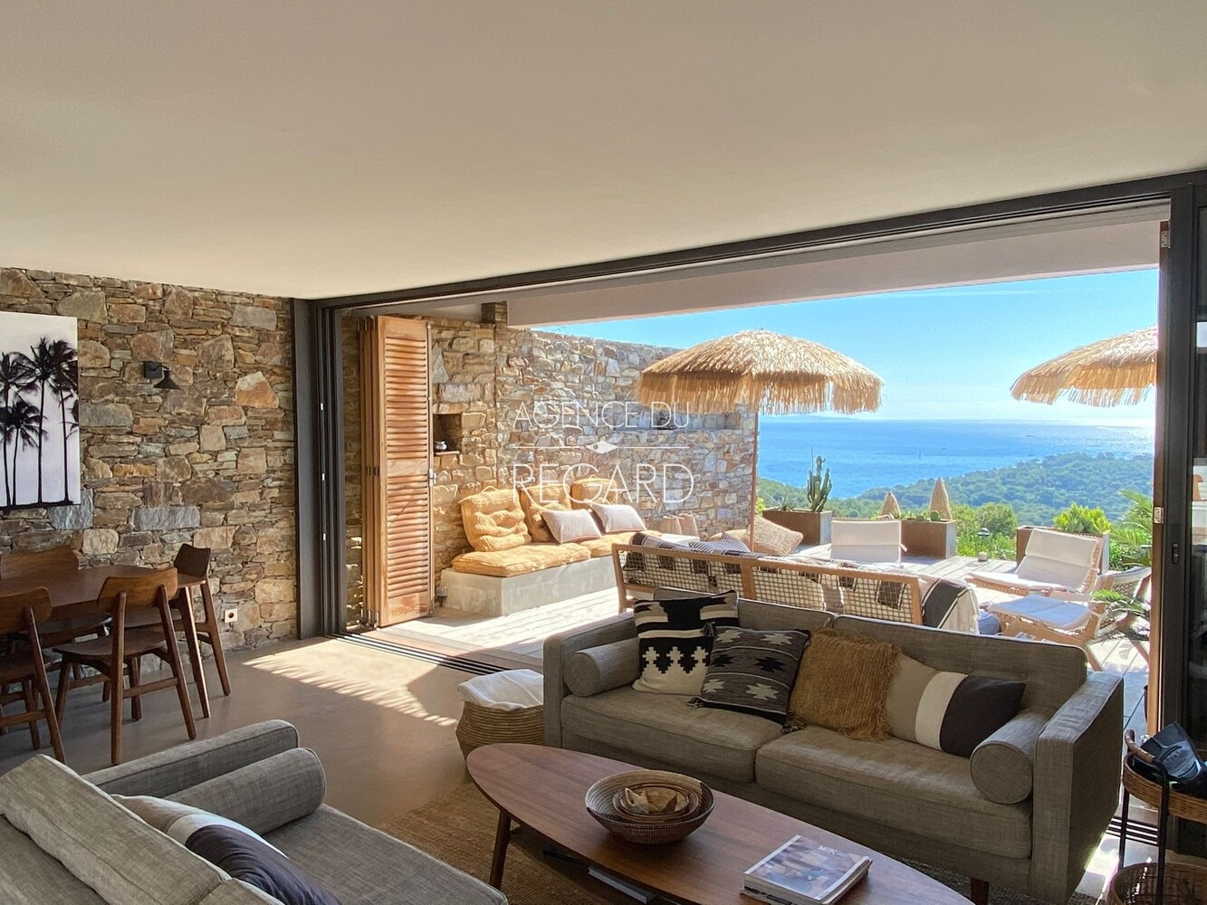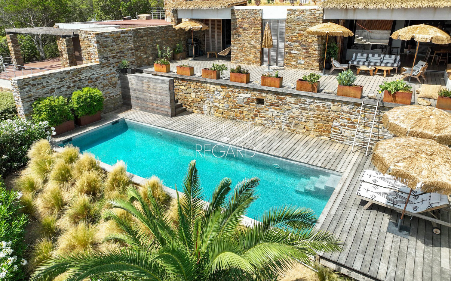 In Bormes-les-Mimosas, in the private and gated Gaou Bénat estate, this 755sqm property enjoys a peaceful, secluded setting and stunning sea views. The 104sqm villa has been tastefully renovated using high-quality materials, combining charm and contemporary comfort. A 29 sqm patio, sheltered from the prevailing winds, offers a transparent sea view. The house extends onto a wooden terrace and then a pool area, revealing a magnificent sea panorama. 3 bedrooms (possibility of 4). Beach 20 minutes walk away. 10x3.5m swimming pool. Pantry. Energy Performance Certificate (EPC) in progress.